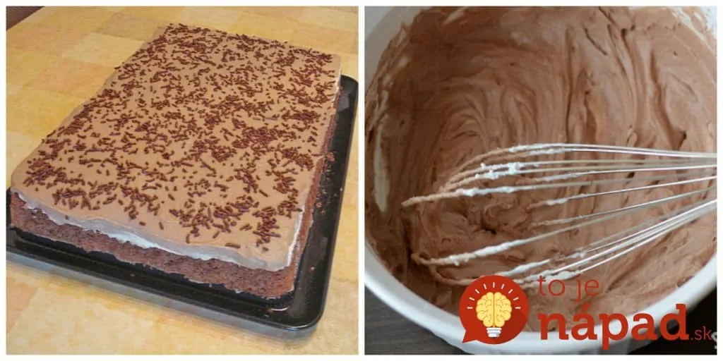 Čokoládovú smotanu necháme vychladnúť. Zvyšnú smotanu vyšľaháme so zvyšným práškovým cukrom na tuhú šľahačku a môžeme začať vrstviť.