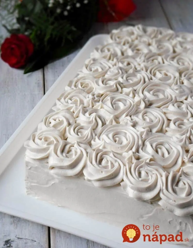 Nakoniec opatrne vmiešame aj sneh a takto prirpavené cesto navrstvíme na plech vystlaný papierom na pečenie, alebo vymastený. Pečieme pri teplote 180 stupňov 25-30 minút. Keď sa cesto ochladí, vložte ho opäť na plech.