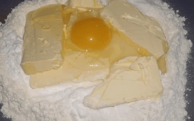 Na dosku preosejeme múku s práškom do pečiva, cukrom, solamylom a urobíme jamku.