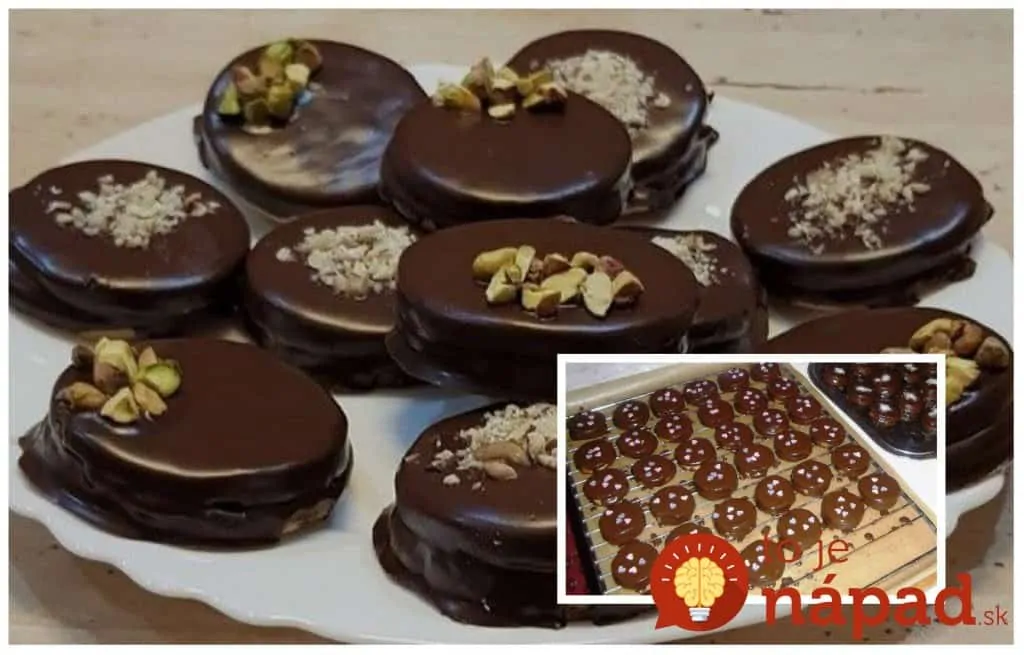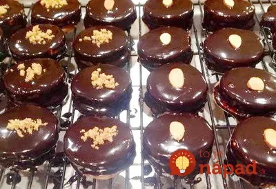 Vychladnuté kolieska zlepíme po dvoch náplňou, namočíme do polevy – buď celé, alebo len polovičku, prípadne len pofŕkame.