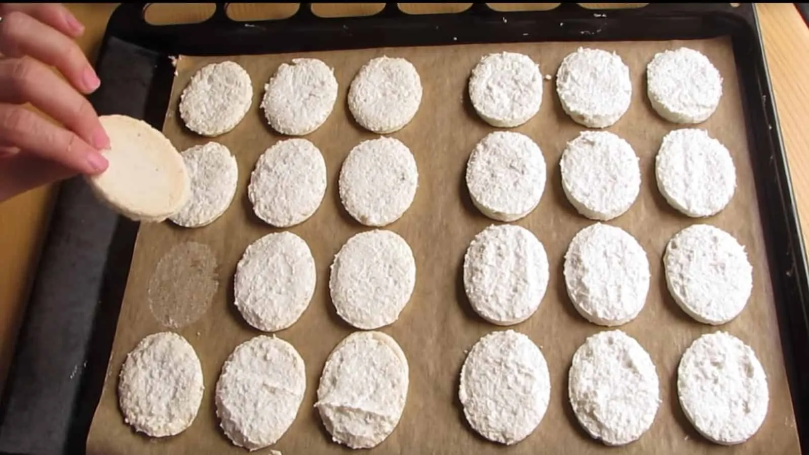 Po dvoch hodinách cesto rozvaľkáme na hrúbku iba asi 2-3 mm a vykrajujeme menšie kolieska, ja robím s priemerom asi 3 cm, kladieme ich na plech vyložený papierom na pečenie a pečieme asi 7 min, pri teplote 180 – 200 stupňov.