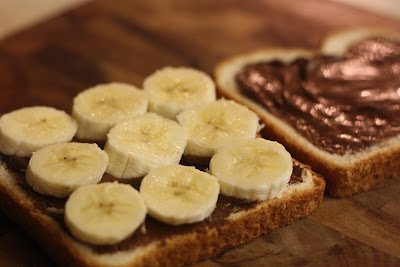 Dva toastové chleby natrieme z vnútornej strany Nutellou. Na jeden plátok chleba naukladáme kolieska banánov a prikryjeme druhým plátkom.