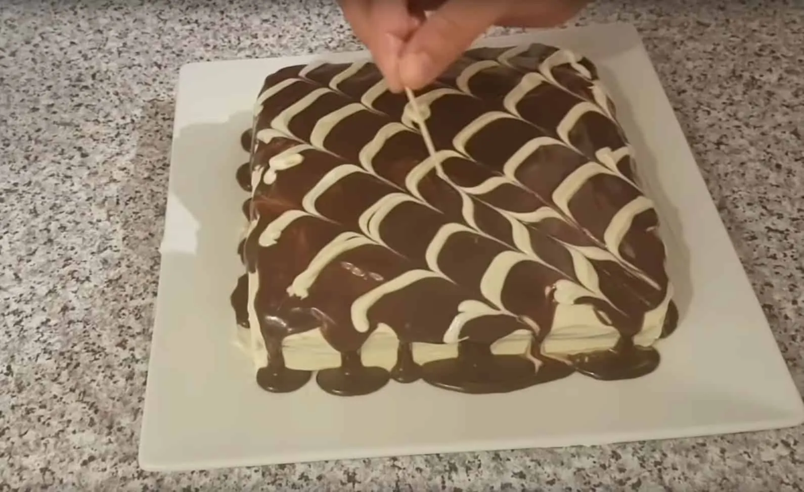Pripravíme si polevu a vrchnú časť celú polejeme. Potom pomocou zdobiaceho vrecúška vytvoríme z krému šikmé pruhy do jednej strany. Zoberieme si špáradlo a ťaháme ho po povrchu torty, akoby sme ním kreslili šikmé pruhy do opačnej strany. Tým sa nám vytvorí efektný vzor. Necháme stuhnúť a podávame.