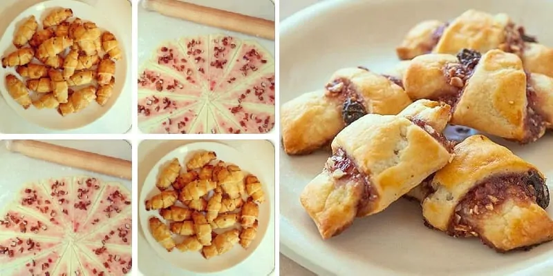 Cesto si pripravte podľa návodu vyššie a na každý trojuholník navrstvite lyžičku malinového (alebo iného) džemu. Zrolujte, potrite vajíčkom a upečte. Hotové rožky posypte práškovým cukrom.