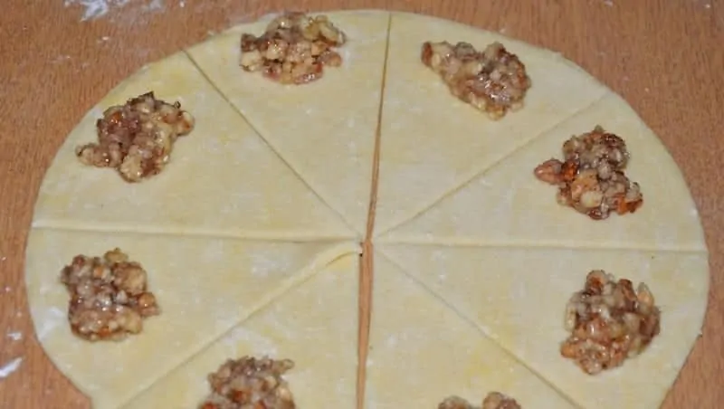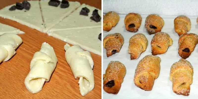 Cesto si opäť rozvaľkajte a rozrežte podľa inštrukcií vyššie, čokoládu nalámte na malé kúsky a navrstvite na každý trojuholník. Potrite žĺtkom, posypte kryštálovým cukrom a upečte.