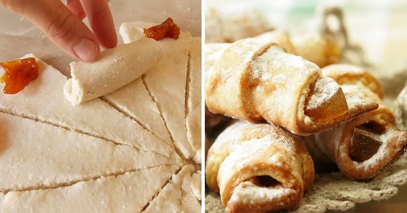 Zo všetkých ingrediencií si vypracujeme cesto a necháme odpočívať v chladničke, najlepšie cez noc. Náplň si pripravte podľa svojich preferencií. Môžete naplniť pokojne aj ovocím, napríklad jahodami, slivkami a pod., alebo džemom. Výber plnky je len na vás. Cesto si potom rozvaľkajte a rozrežte rovnomerne na trojuholníky. Plnku vrstvite vždy do najširšej časti, zrolujte a potrite žĺtkom. Naukladajte na plech vedľa seba (plech nemusíte vymastiť, keďže cesto obsahuje maslo) a dajte piecť do predhriatej rúry na 180 stupňov asi na 20 minút. Rožky so sladkou plnkou môžete potom posypať práškovým cukrom a ak ste ich pripravili na slano, môžete zvoliť syrovú, prípadne sezamovú posýpku.
