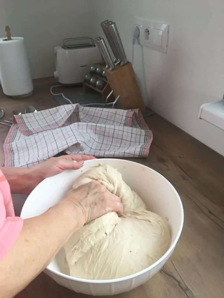 Múku vložte do misy a utvorte uprostred jamku, sem pridajte cukor, soľ, olivový olej, vodu a droždie. Cesto premiešajte a hneďte asi 5 minút.