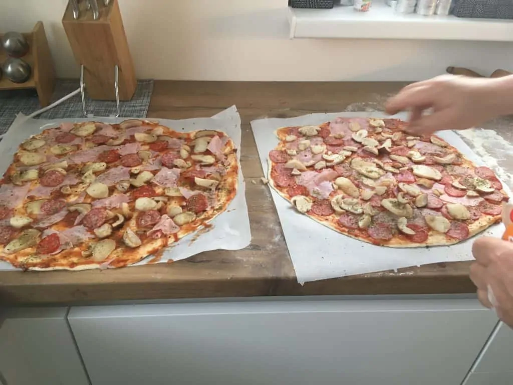 Potom vložte cesto do misky, prikryte uterákom a nechajte 1 hodinu, aby vykyslo. Potom ho rozvaľkajte, pridajte omáčku a syry. Pečte pri 190-200 stupňoch po dobu 20 minút. Môžete piecť aj pri teplote 230-250 stupňov, ale vtedy stačí naozaj len 7-8 minút a určite odporúčame cesto za každých okolností slôedovať.