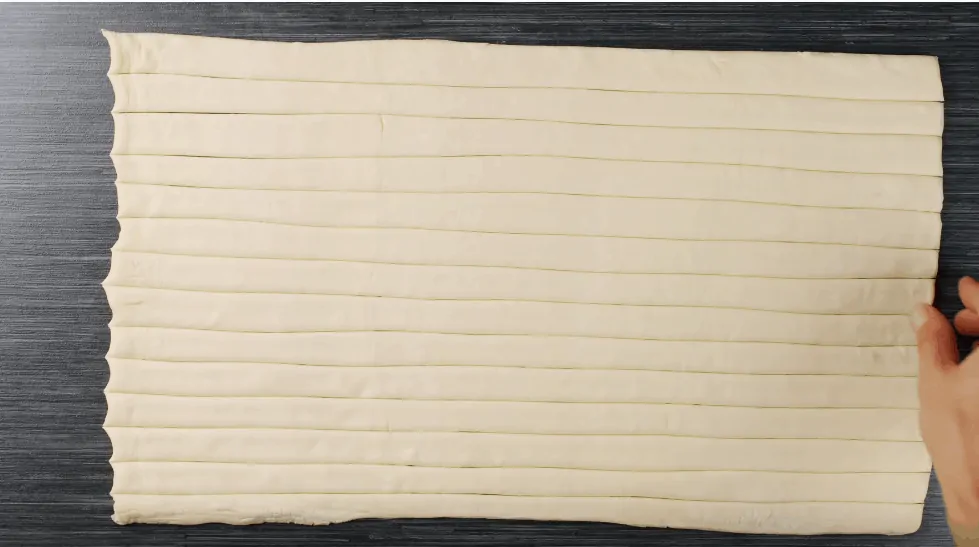 Lístkové cesto si rozvaľkáme na plát a narežeme na pásiky.