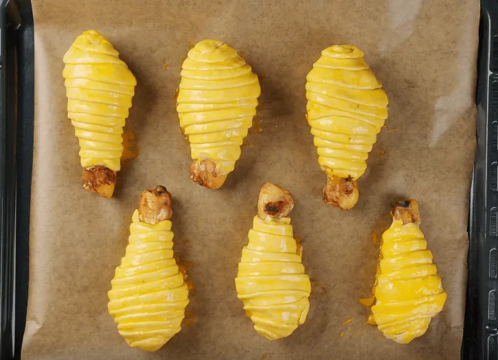 Z lístkového cesta vykrojíme 6 štvorcov s rozmermi cca 15×15 cm. Do stredu každého štvorca vložíme kuracie stehno a nanesieme naň 2-3 lyžice hubovo-zemiakovej plnky (viď obrázok). Potom stehienka zabalíme do tvaru mešca, ktorý pri konci stiahneme pomocou nite (nie však príliš natesno).