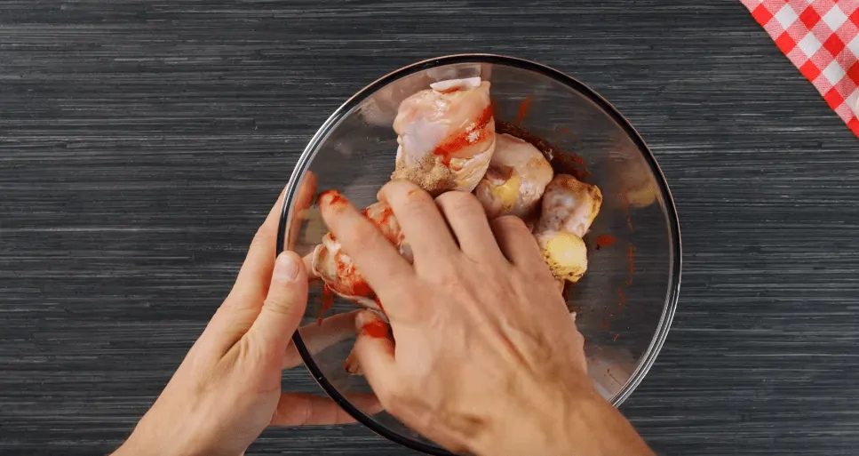 Na povrchu kuracích stehienok urobíme niekoľko zárezov, zmiešame so všetkými prísadami na na marinádu a dobre premiešame.