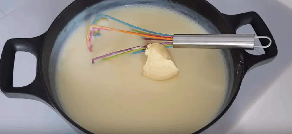 V mlieku rozmiešame žĺtky, cukor, škrob a uvaríme hustý krém. Pridáme maslo a miešaním rozpustíme.