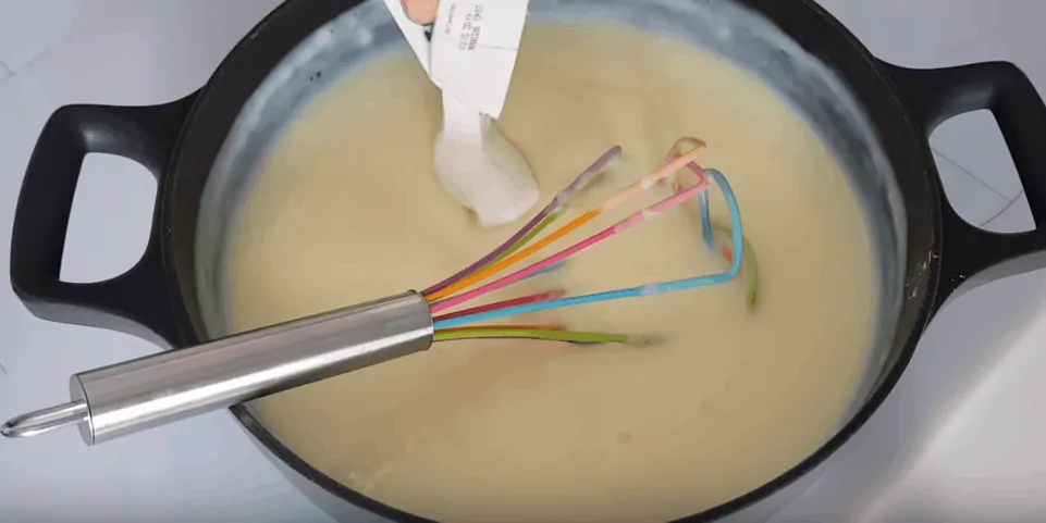 Pridáme aj smotanu na šľahanie, soľ a rozmiešame.