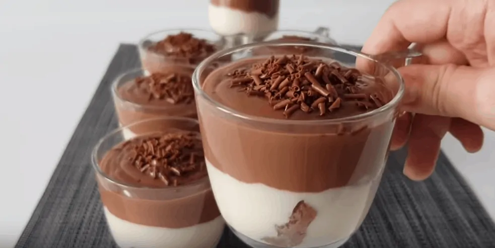 Fantastický dezert pre celú rodinu, dvojfarebné poháre s čokoládou a smotanou.