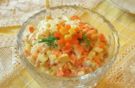 Uvarenú zeleninu necháme úplne vychladnúť a potom ju pokrájanú pridáme k šalátu. Osolíme, okoreníme, pridáme kukuricu, vajcia a vmiešame jogurt alebo domácu majonézu s troškou horčice. Premiešame, ochutíme a necháme uležať v chladničke.