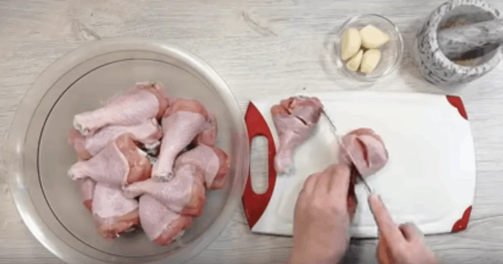 Povrch každého stehienka na povrchu narežeme.