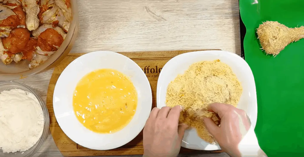 Obaľujeme stehienka najskôr v múke, potom v rozšľahanom vajíčku a nakoniec v strúhankovej zmesi.