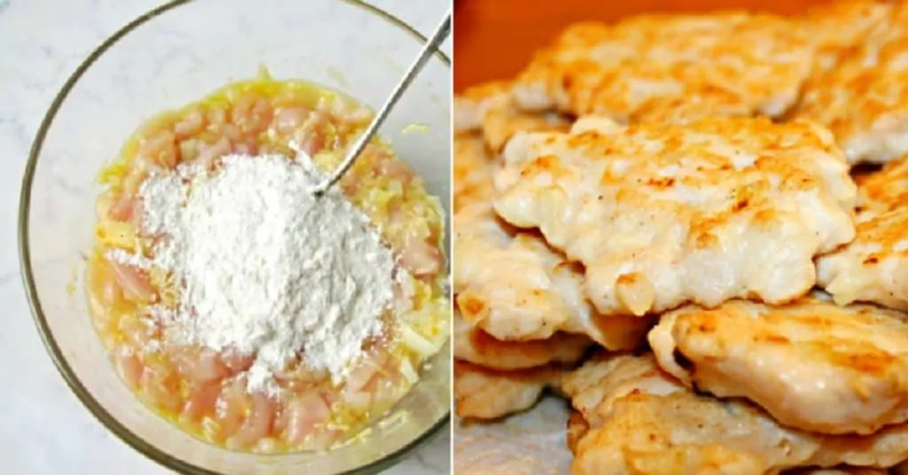 Kuracie prsia umyjeme a nakrájame na malé kúsky. Osušíme papierovým servítkom a potom obalíme v múke.