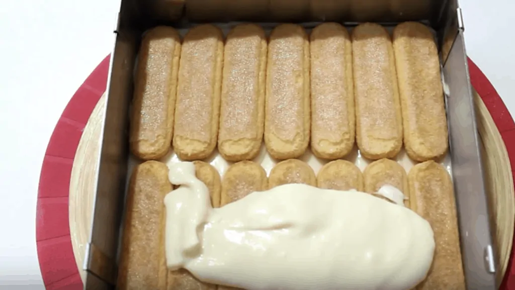 Dlhé piškótu krátko namočíme vo vychladnutej káve a ukladáme na tácku tesne vedľa seba. Smotanová náplň je hustá, preto sa najlepšie nanáša pomocou zdobiaceho sáčku, postačí aj obyčajný so zastrihnutým koncom. Ak sa vm nechce s krémom hrať, jednoducho ho natrite stierkou.