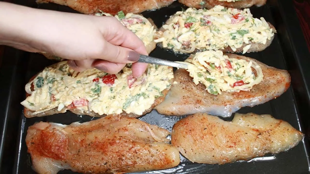 Naukladáme vedľa seba kuracie plátky a na ne navrstvíme pripravenú zmes.