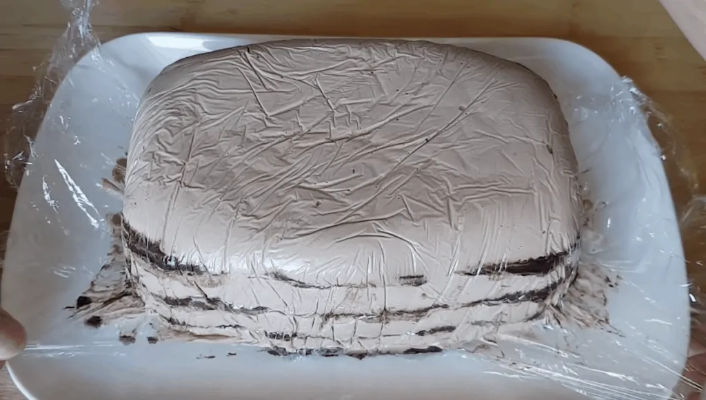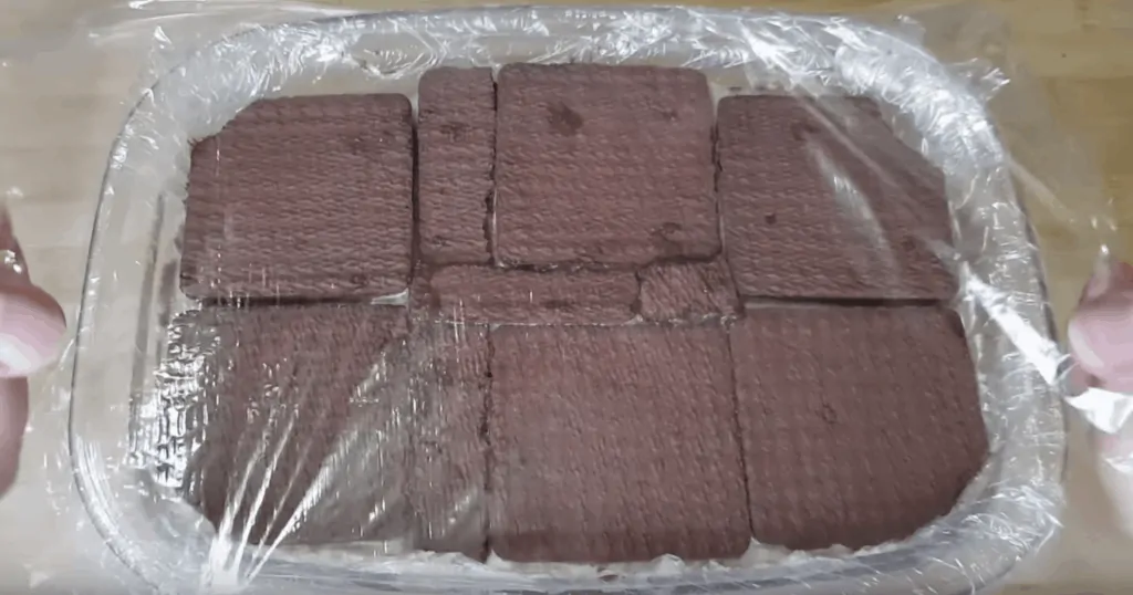 Pozdĺžnu formu na pečenie vyložíme fóliou. Na dno uložíme sušienky a tie pokryjeme vrstvou krému. Pokračujeme v striedaní vrstiev krému a sušienok, kým nevyplníme celú formu (mali by sme mať 6 vrstiev sušienok).
