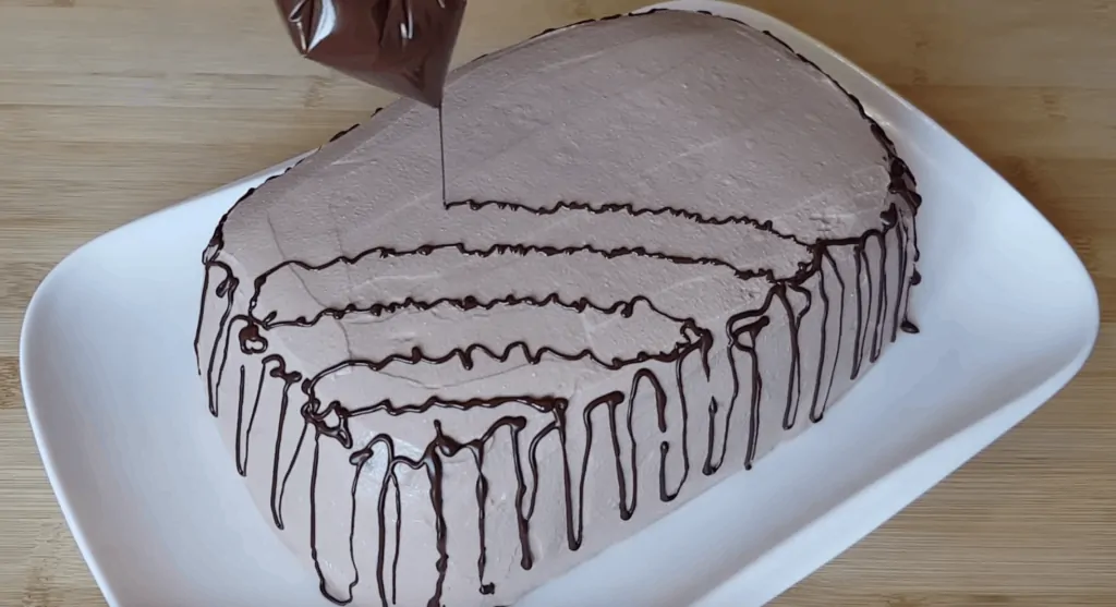 Dezert vložíme do chladničky a necháme dostatočne stuhnúť. Potom vyklopíme na rovný povrch, prelejeme rozpustenou čokoládou a môžeme podávať.