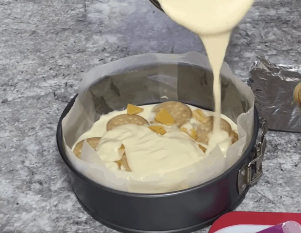 Formu na pečenie vymastíme maslom a sušienky nalámeme na menšie kúsky. Z mlieka, pudingových práškov a cukru uvaríme hustý puding. Puding necháme chvíľu vychladnúť a kým je ešte teplý, vmiešame doň maslo, vanilkovú arómu a kyslú smotanu.