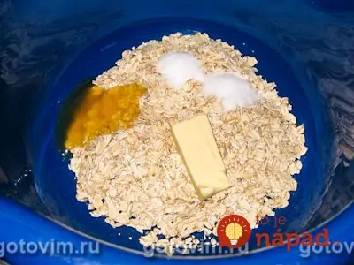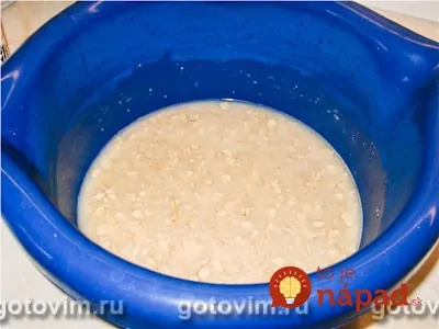 Do misky si dáme vločky, maslo a med, soľ, zalejeme vriacou vodou a necháme vychladnúť na 37 stupňov. Potom pridáme kvasnice a múku. Všetko dobre vymiešame pomocou ručného šľahača.