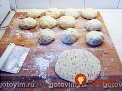 Cesto potom rozdelíme na pomúčenej doske na bochníčky (asi 12 kusov) a každý rozvaľkáme na placku s hrúbkou cca 0,5 cm. Popicháme vidličkou a preložíme na plech vystlaný papierom na pečenie.