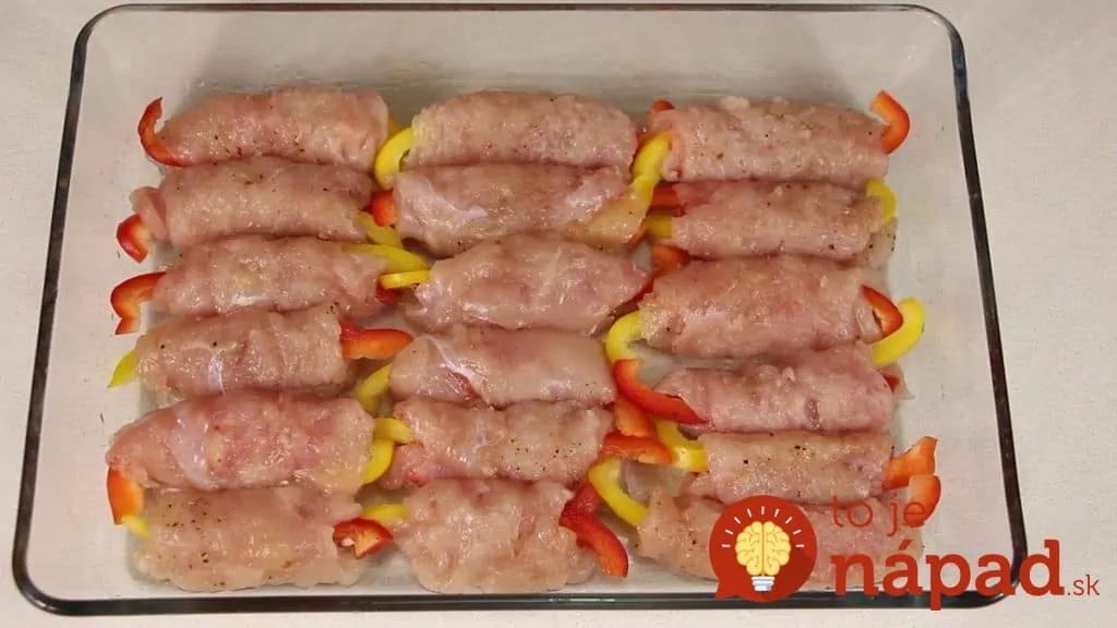 Plátky následne zrolujeme, ak je to potrebné upevníme špáradlom a uložíme do vopred vymastenej zapekacej misy.