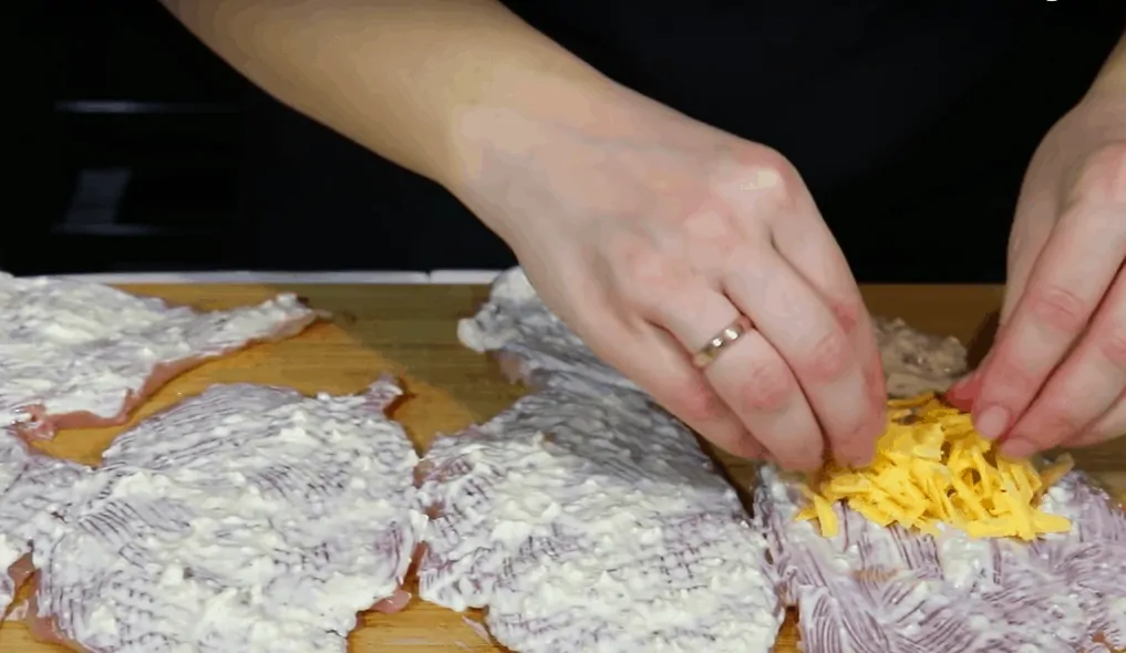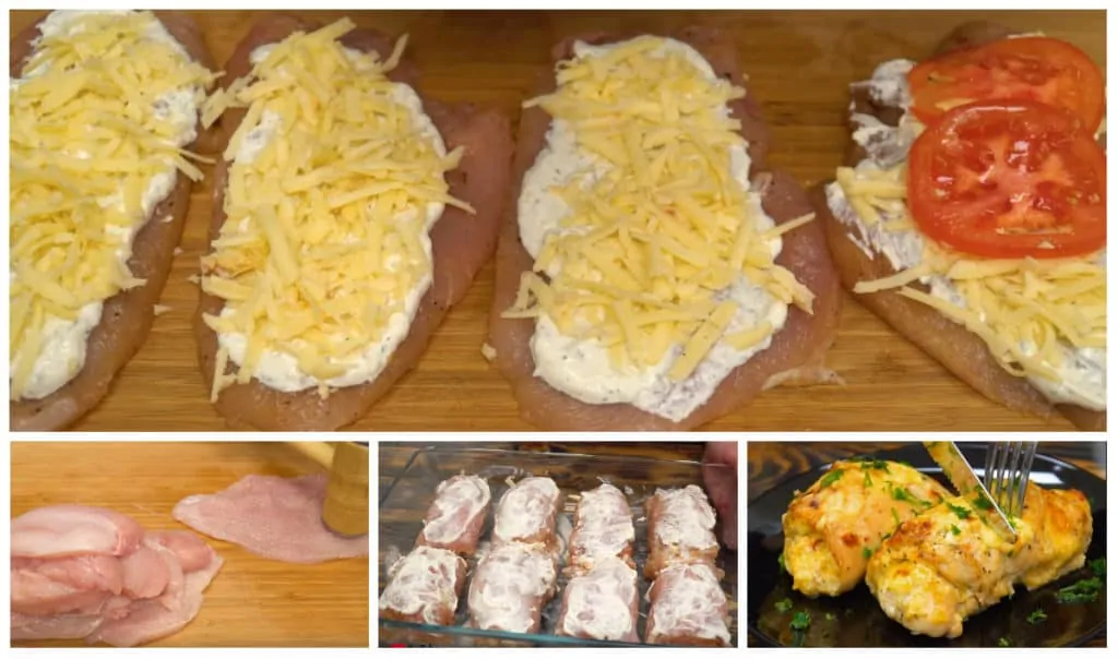 Kuracie prsia si prekrojíme na polovice a každú naklepeme na čo najtenšie. Ochutíme soľou a korením. Každý kúsok potrieme trochou horčice a vložíme do stredu kúsok syra, zabalíme. Preložíme na plech vystlaný alobalom.