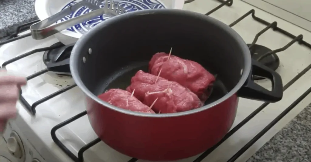 Závitky sprudka orestujeme zo všetkých strán, aby sa mäsko zatiahlo.