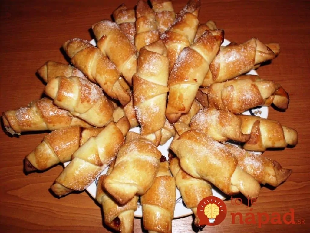 Rohlíčky potrieme rozšľahaným vajcom a upečieme doružova. Ešte horúce posypeme práškovým cukrom