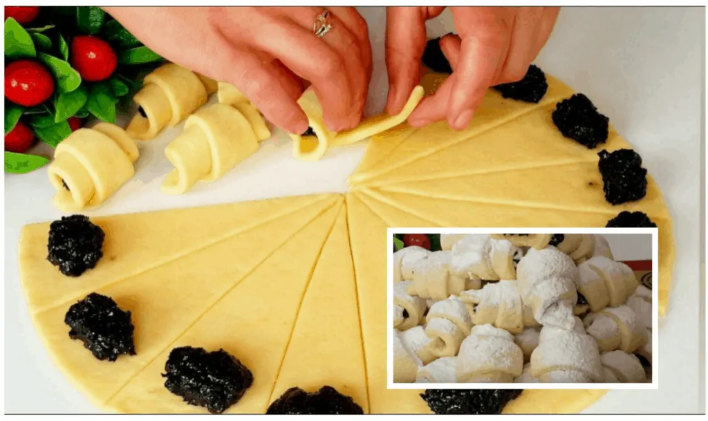 Každý kúsok vyvaľkáme na kruh a rozdelíme na osminky. Na každý kúsok dáme náplň a zabalíme do rožtekov – začíname na širšej strane.