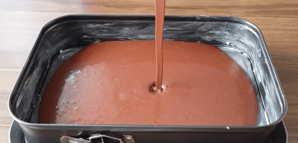 Vyšľaháme žĺtky s práškovým cukrom, pridáme olej, múku zmiešanú s práškom do pečiva, kakao a vyšľahaný tuhý sneh.