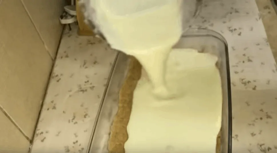 Cesto vyberieme z chladničky, rozvaľkáme na pracovnej doske a vložíme do vymasteného a múkou vysypaného plechu. Na cesto navrstvíme krém a vložíme do vyhriatej rúry. Pečieme pri teplote 180 stupňov približne 40 minút.
