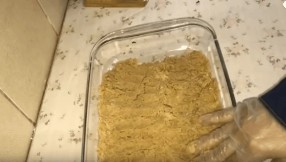 Sušienky rozdrvíme v mixéry a zmiešame s rozpusteným maslom. Hmotu, ktorá nám takto vznikne navrstvíme na dno misy alebo menšej formy s vyššími okrajmi.