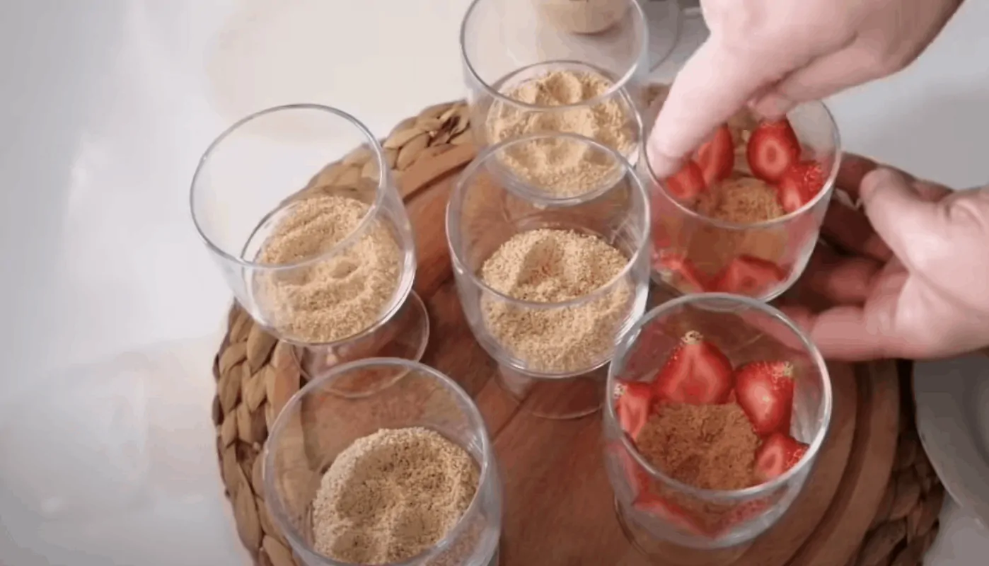 Pripravíme si čisté dezertné poháre. Vrstvíme sušienkovú zmes, krém a jahody. Dezert vložíme do na chvíľu do chladničky.