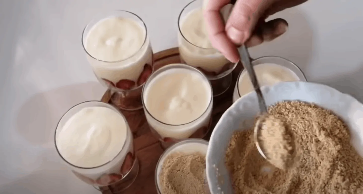 Na dno pohárov navrstvíme sušienkovú drť, uložíme kúsky jahôd, navstvíme krém.