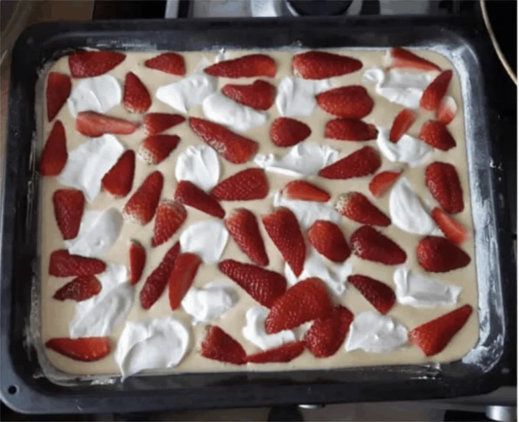 Múku zmiešame s práškom do pečiva. Vajcia ušľaháme s cukrom od peny, postupne pridáme olej, mlieko, vanilkový cukor a nakoniec múku s práškom do pečiva. Vymiešame cesto, ktoré navrstvíme na vymastený a múkou vysypaný plech. Na cesto uložíme jahody nakrájané na plátky.