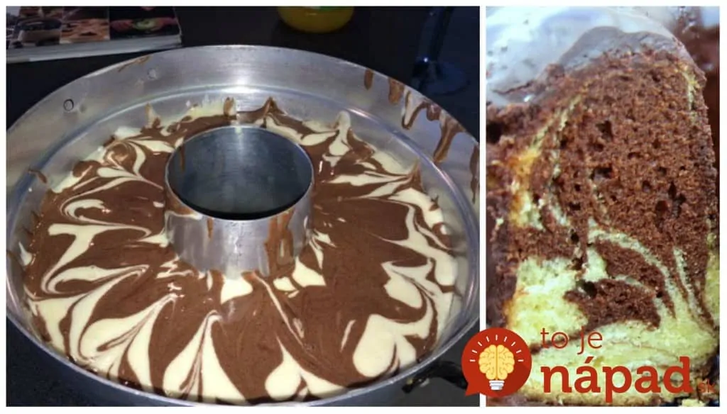 Do vymastenej a múkou vysypanej bábovkovej formy striedavo plníme svetlé a tmavé cesto. Môžeme si pomôcť lyžicou a vytvárať v ceste jednoduché vzory.