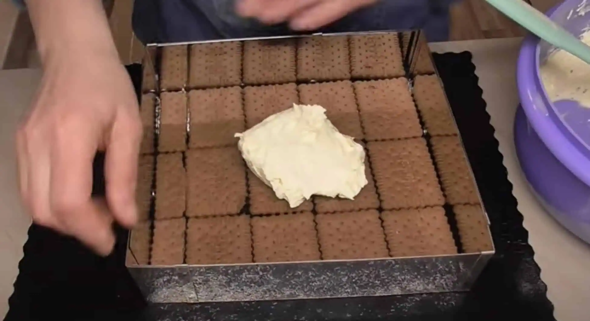 Teraz si na dno plechu naukladajte sušienky a na ne navrstvite časť krému.
