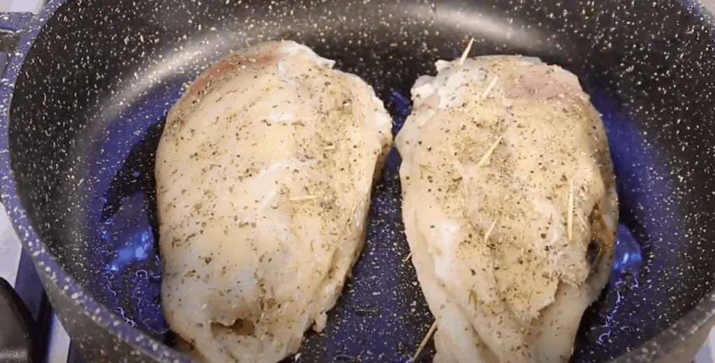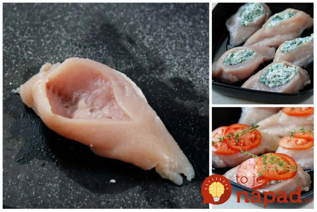 Umyté kuracie prsia narežeme tak, aby nám vznikla „kapsa“ na plnenie. Do vnútra navrstvíme špenátovú náplň a jeden kúsok syra. Potom mäso osolíme podľa chuti (môžeme pridať aj ľubovolné korenie).