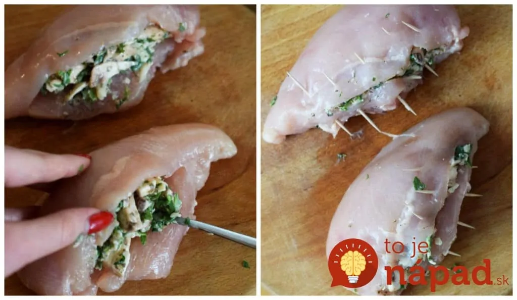 S ostrým nožom, prerežeme každé kus kuracích pŕs tak, aby mohli byť naplnené a ochutíme ich soľou a korením. V miske premiešajte nasekané huby, pretlačený cesnak, kyslú smotanu, korenie a špenát. Umiestnite náplň na každé prsia a potom prsia prilepte s náplňou vo vnútri. Kuracie vrecká plnené šampiňónmi a syrom. Upevníme ich malými špáradlami, aby sme udržali plnku vo vnútri. Posypeme korením na kuracie mäso.