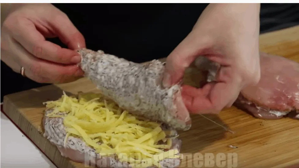Takisto každý plátok vložíme do drážky v mäse.
