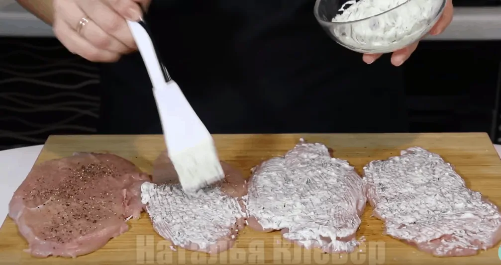 Potom prikryte druhým kúskom mäsa – opäť ochuťte soľou, korením a potrite omáčkou.