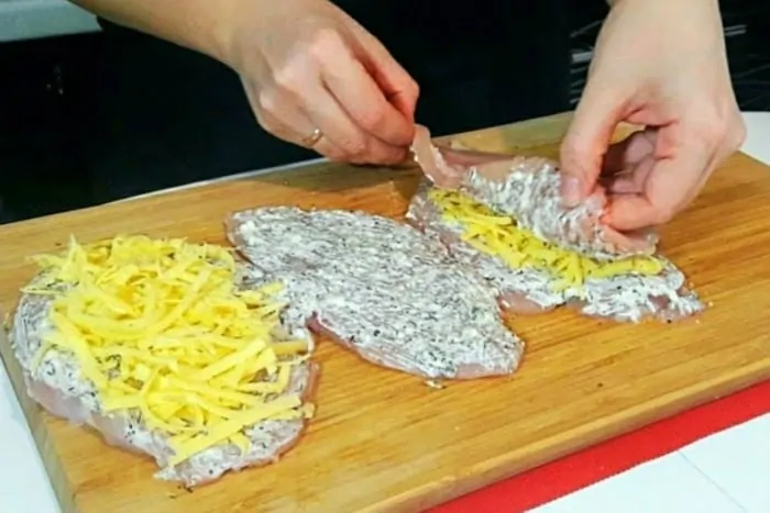 Kuracie rezne vyberieme z mlieka, narežeme a pozdĺž rezu urobíme otvor tak, aby ste získali malú kapsu.