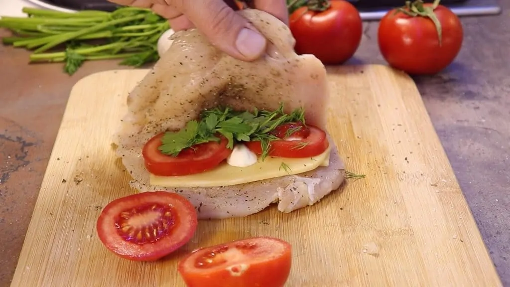 Kuracie prsia umyjeme a osušíme papierovým obrúskom. Osolíme a na vrchu urobíme hlbší zárez – vznikne nám akési vrecko, do ktorého navrstvíme syrovú náplň. Prikryjeme 1-3 plátkami paradajok.