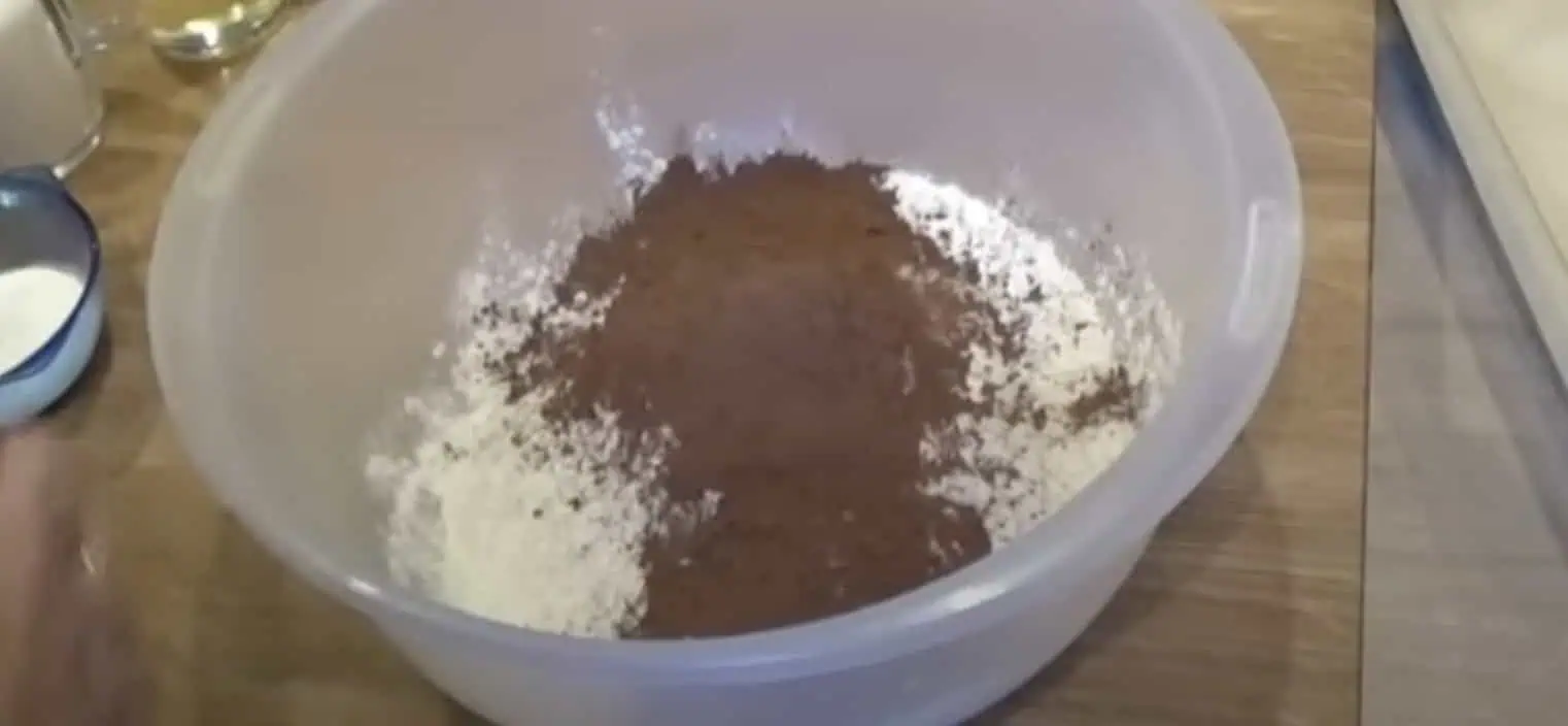 Do misky si nasypeme všetky suché prísady (múku, cukor, vanilkový cukor, kakao, prášok do pečiva) a premiešame.