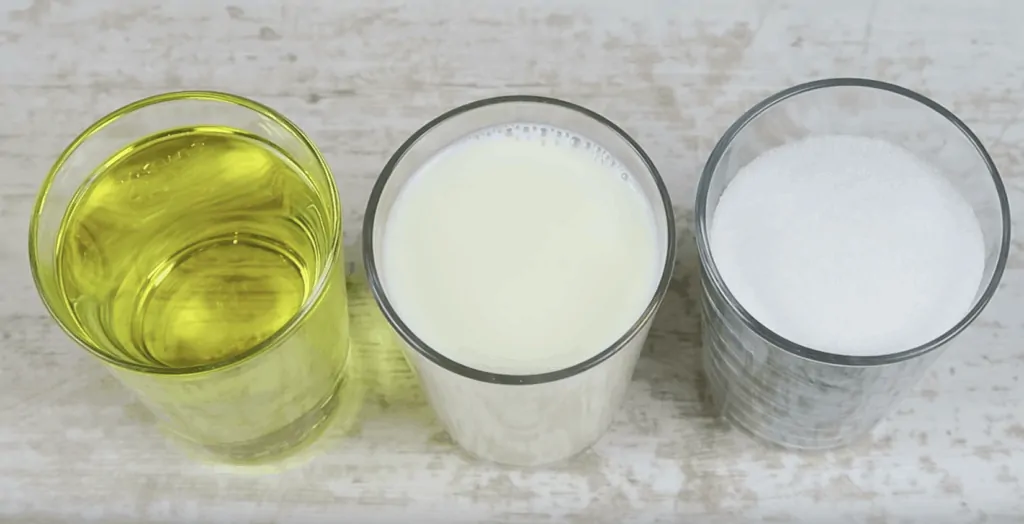 Na odmeranie cukru, oleja a mlieka je použitý pohár s objemom 250 ml